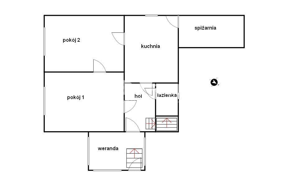 UKŁAD DOMU: weranda(8,86 m2), hol (6,12 m2), dwa pokoje przechodnie o pow. 19,52 m2 i18,44m2, kuchnia (14,92 m2), z której można przejść do drugiego pokoju, spiżarnia, łazienka (ok. 2,66 m2 po podłodze). Na poddaszu znajduje się hol o pow. ok. 8,75m2 oraz pokój o pow. ok. 12,77 m2.Wysokość tych pomieszczeń wynosi 1,86m. Wysokość parteru to2,50m.